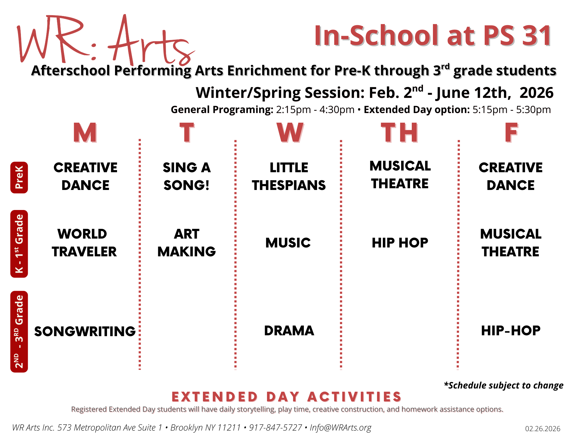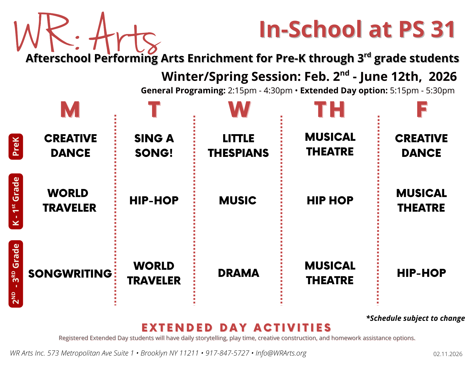 Afterschool arts enrichment programming for PK through 3rd grade right in PS 31!